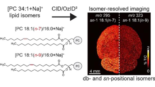組織內(nèi)脂質(zhì)的質(zhì)譜成像(MSI)在生物分子發(fā)現(xiàn)和組織病理學(xué)應(yīng)用方面具有重要潛力。然而,傳統(tǒng)的MSI技術(shù)受到了磷脂區(qū)域異構(gòu)體的普遍存在的挑戰(zhàn),這些異構(gòu)體僅在碳-碳雙鍵的位置和/或脂肪?;c甘油主鏈的相對(duì)位置(即sn位置)上有所不同。成像實(shí)驗(yàn)中無(wú)法解析異構(gòu)體脂質(zhì)掩蓋了潛在的復(fù)雜性,導(dǎo)致代謝信息的嚴(yán)重丟失。在此,臭氧誘導(dǎo)解離(OzID)在能夠進(jìn)行基質(zhì)輔助激光解吸/電離(MALDI)的遷移率啟用四極飛行時(shí)間(Q-TOF)質(zhì)譜儀上實(shí)現(xiàn)。利用Q-TOF中的離子遷移區(qū),獲得了高數(shù)量密度的臭氧,導(dǎo)致∼與早期MALDI OzID實(shí)施相比,OzID產(chǎn)物離子豐度提高了1000倍。將這種提升轉(zhuǎn)化為成像導(dǎo)致采集率提高了50倍,有助于磷脂異構(gòu)體分辨率的大面積繪圖。繪制大鼠腦切片的異構(gòu)體分布圖揭示了脂質(zhì)異構(gòu)體群體的不同分布,其雙鍵和sn位置不同的異構(gòu)體的區(qū)域特異性關(guān)聯(lián)。此外,由臭氧和碰撞誘導(dǎo)的連續(xù)離解產(chǎn)生的產(chǎn)物離子在非經(jīng)典sn-1位置酯化的不飽和脂肪?;溨袑?shí)現(xiàn)了雙鍵分配。