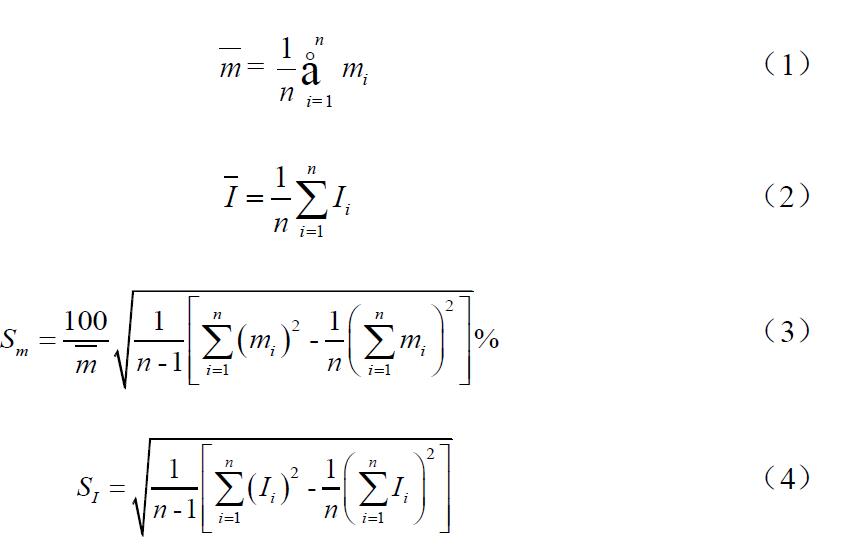 多點校準(zhǔn)的平均斜率與平均截距分別按公式(1)和公式(2)進行計算;多點校準(zhǔn)斜率的相對標(biāo)準(zhǔn)偏差和截距的標(biāo)準(zhǔn)偏差分別按公式(3)和公式(4)進行計算。