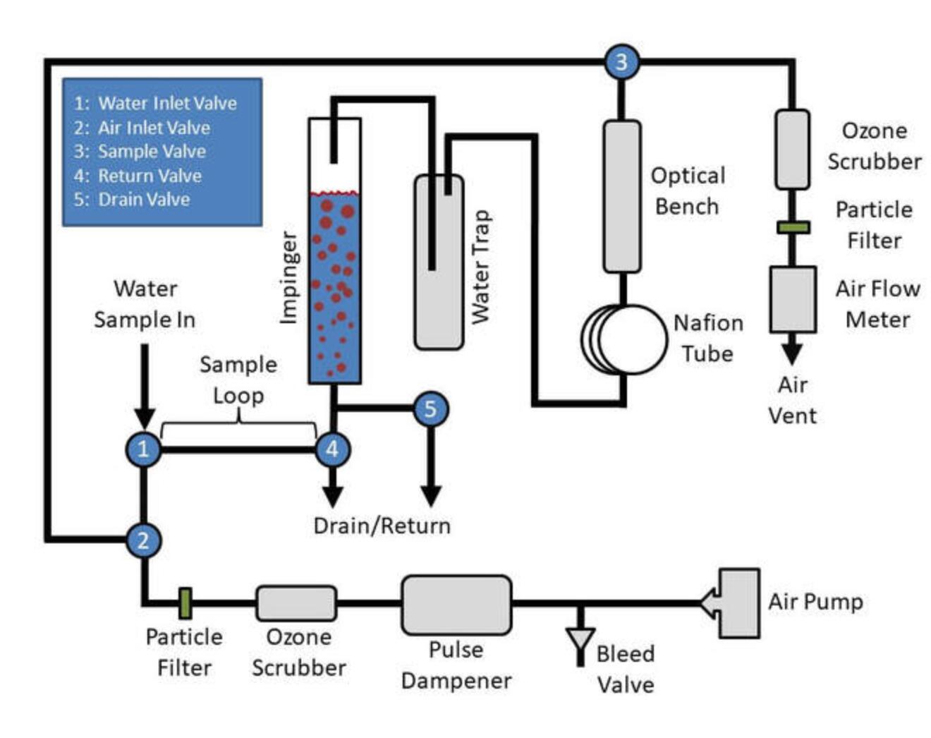 下面的示意圖顯示了儀器操作所需的附加組件。其中包括用于調(diào)節(jié)空氣流速的放氣閥、用于減少氣流波動的脈沖阻尼器、用于從環(huán)境空氣中去除臭氧的臭氧洗滌器用于噴射樣品并從排出的空氣中洗滌臭氧、空氣顆粒過濾器、用于保護(hù)空氣的集水器光學(xué)平臺暴露于液態(tài)水,Nafion 管平衡環(huán)境空氣的濕度,以及空氣流量計(jì)。